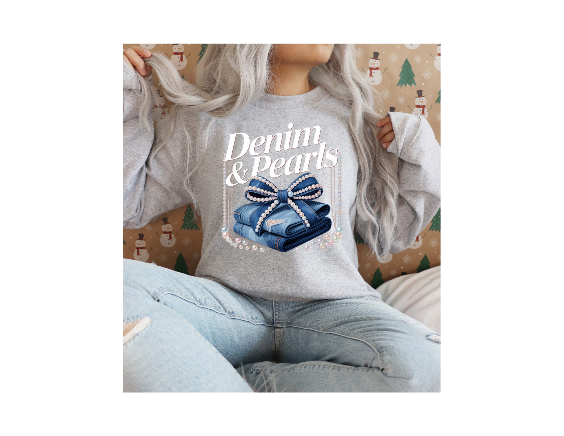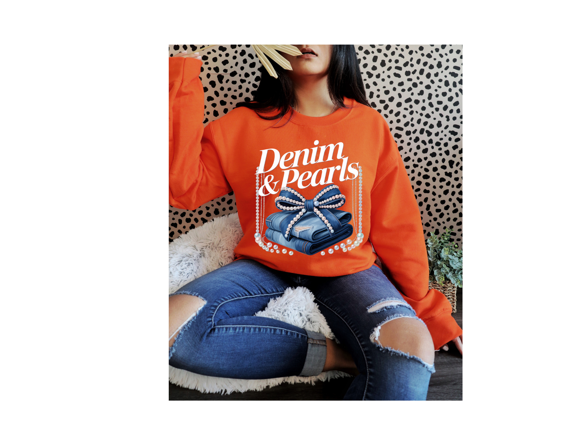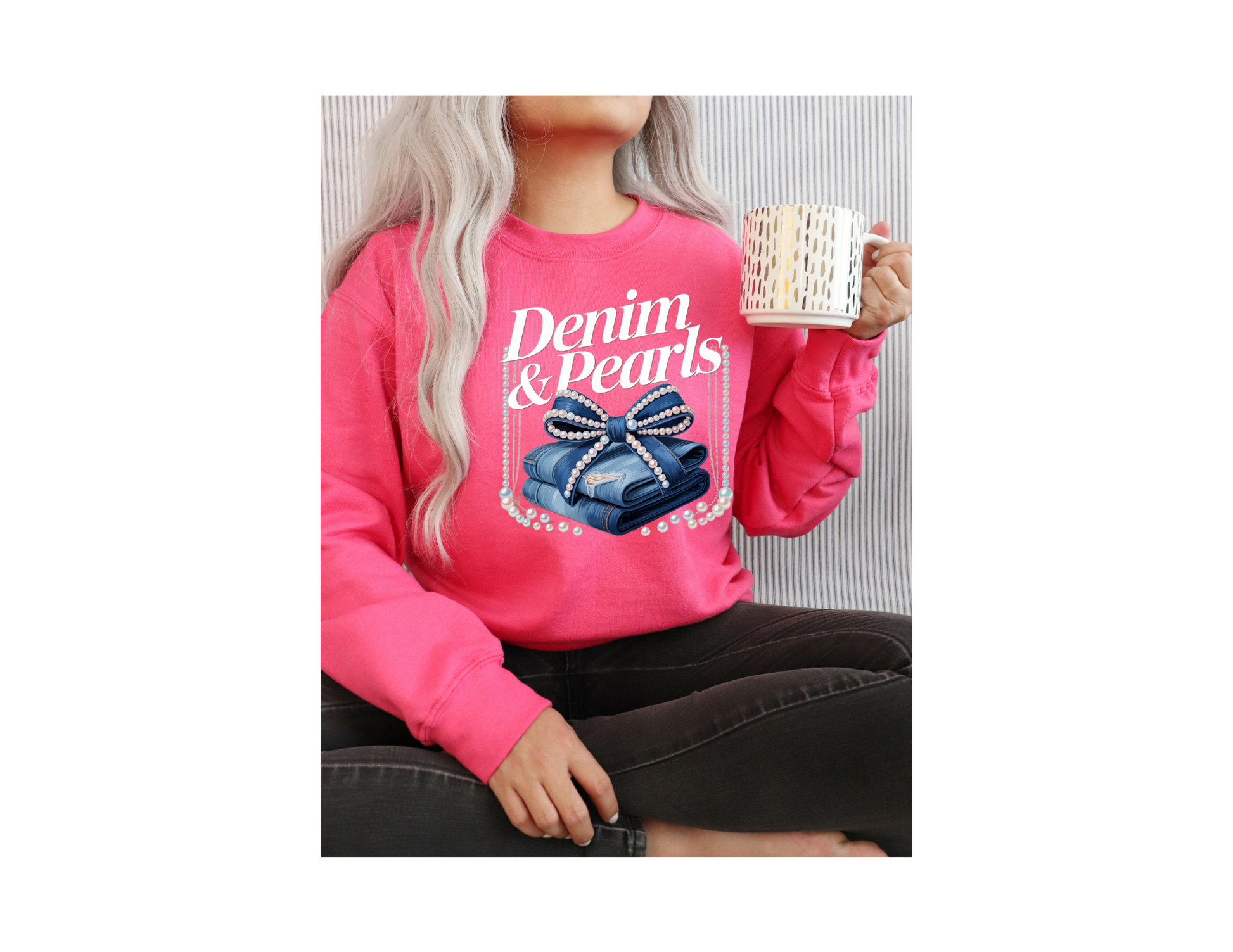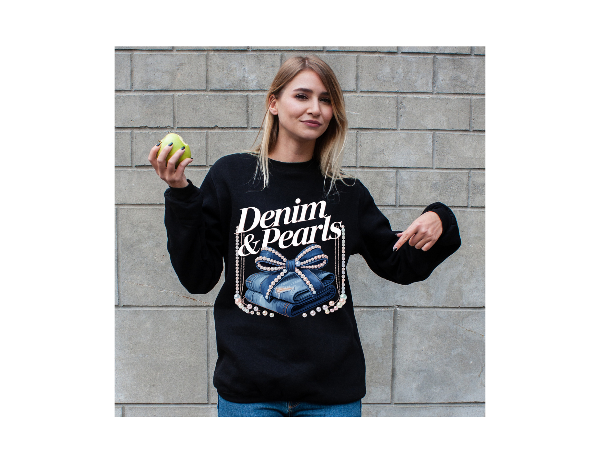 This Demin & Pearls sweatshirt combines the casual comfort of blue jean fabric with elegant swing pearl rope detailing, offering a unique blend of laid-back style and refined design. Perfect for adding a sophisticated touch to your everyday wardrobe, it elevates a classic sweatshirt with subtle, eye-catching accents. Ideal for those who appreciate craftsmanship and distinctive fashion statements.