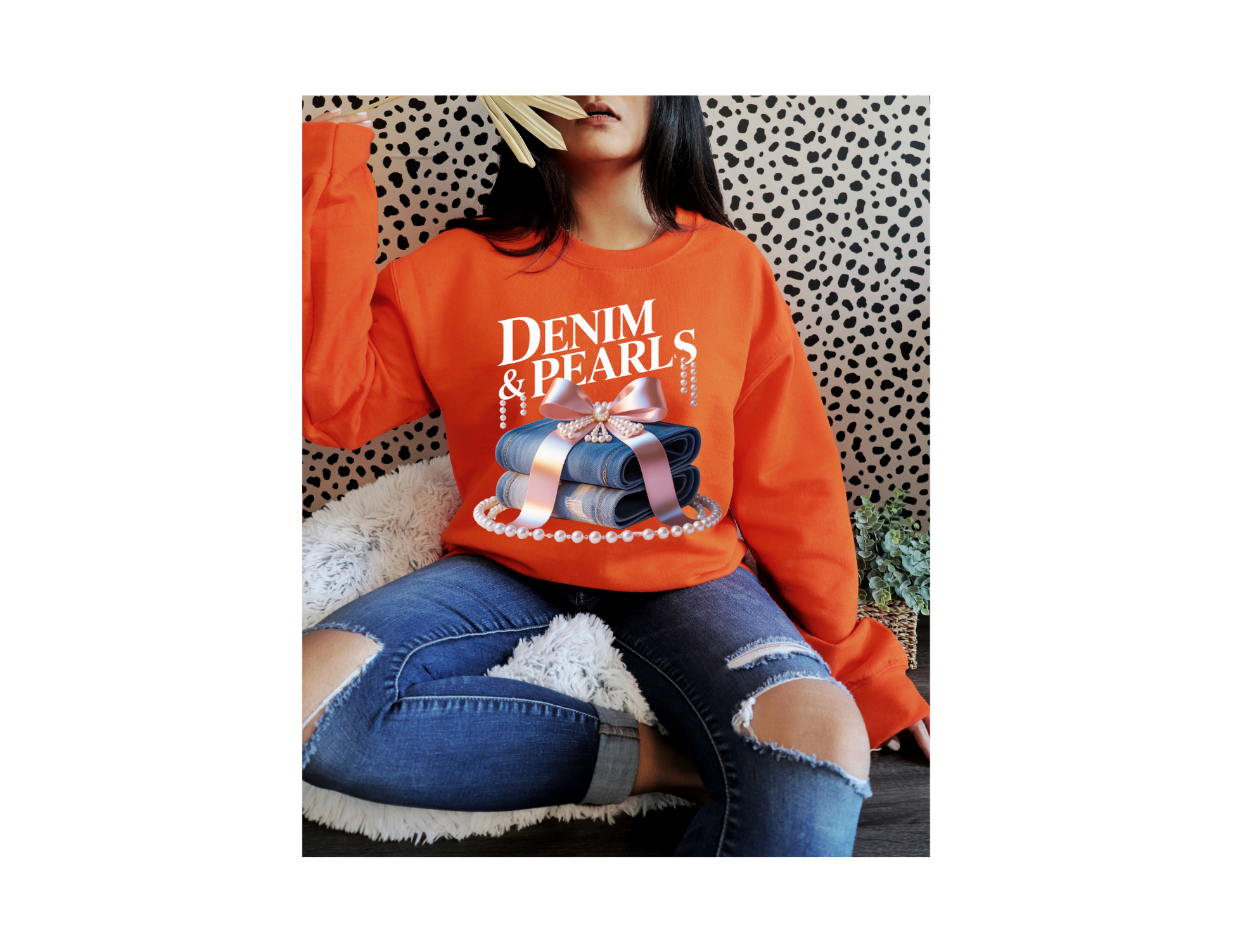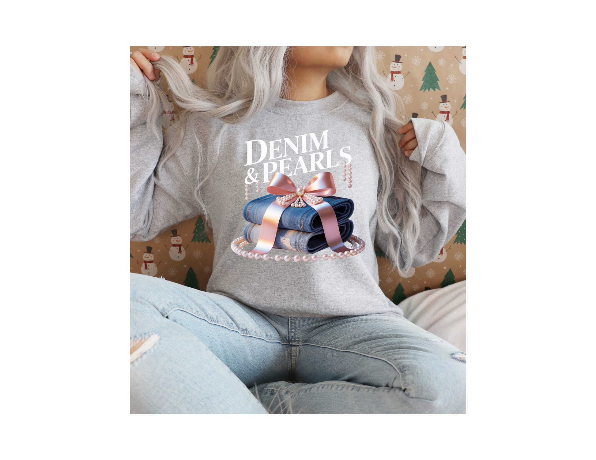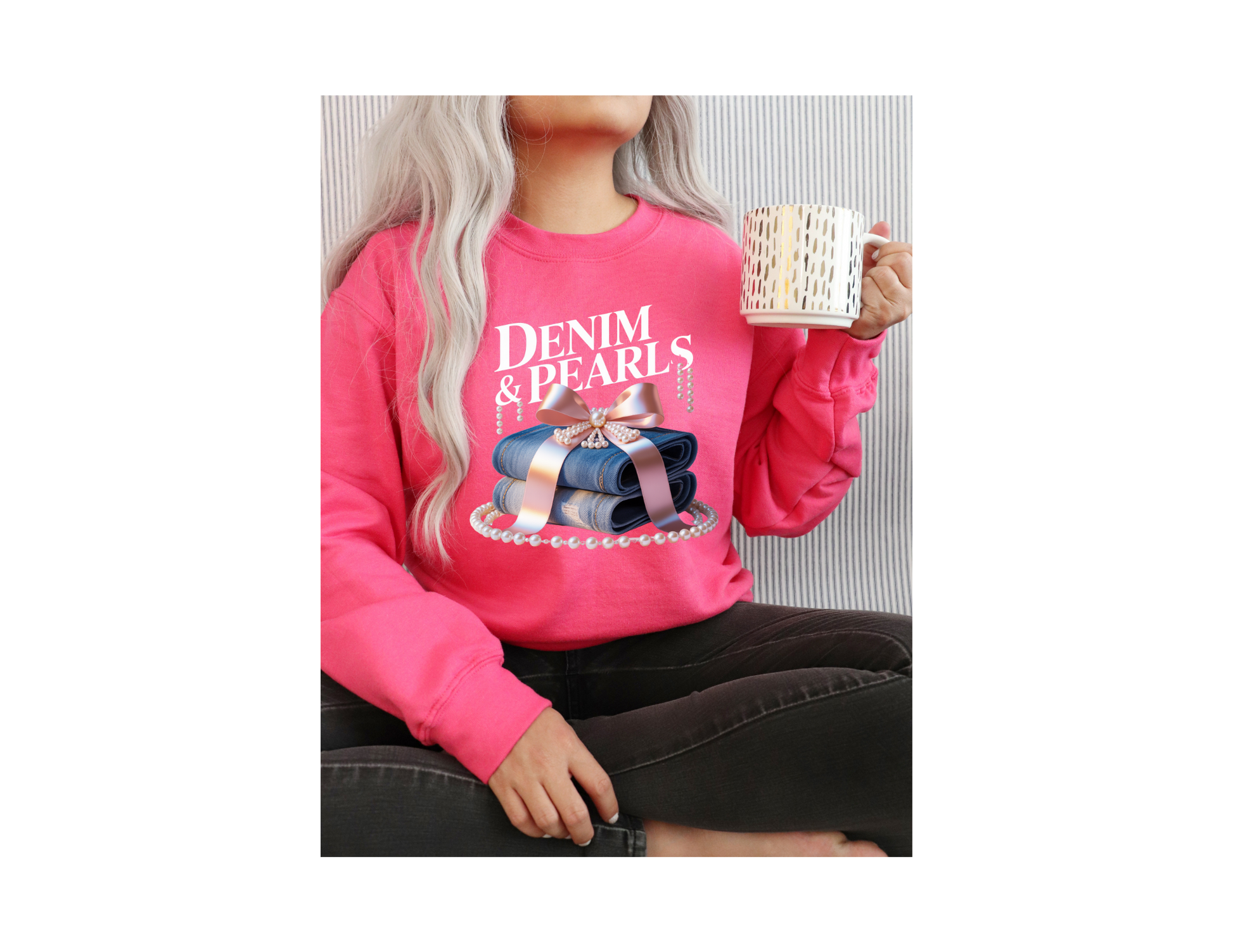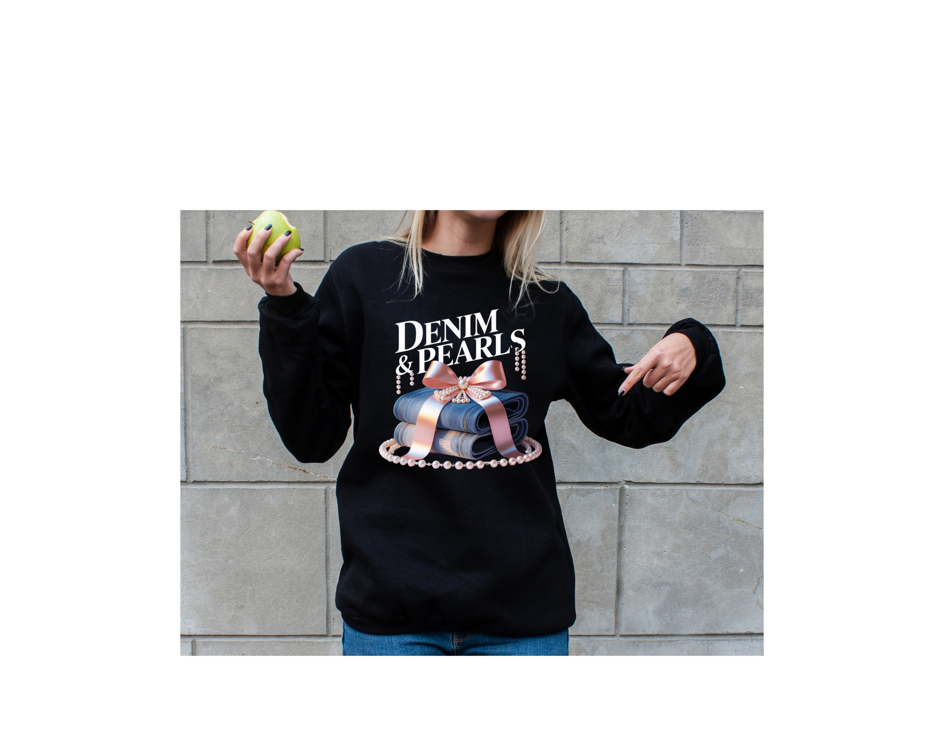 This Denim and Pearls sweatshirt combines casual comfort with elegant detailing. Crafted from soft denim fabric, it features a distinctive circle bottom adorned with a rope of pearls, adding a refined touch to a classic silhouette. Perfect for elevating everyday wear, this sweatshirt offers both style and sophistication with a unique design that stands out effortlessly.