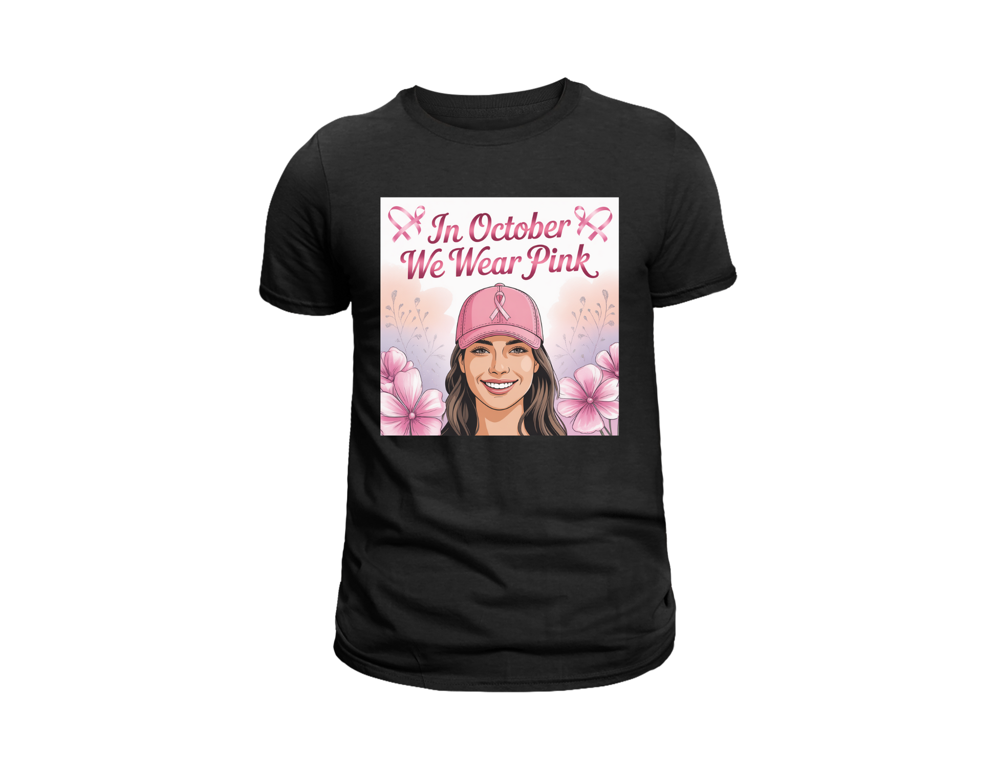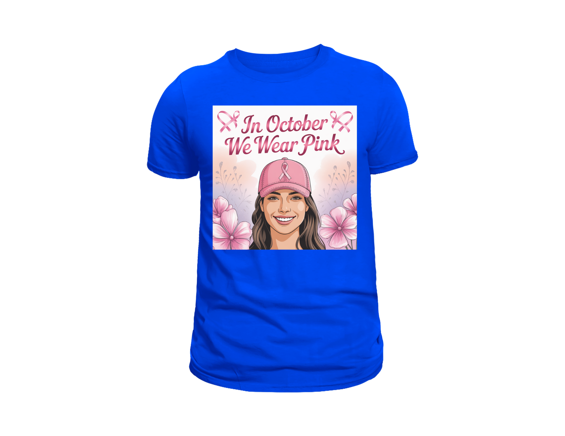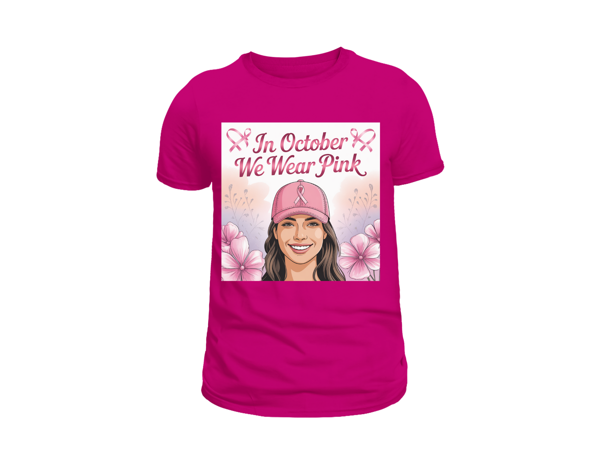 Show your support for cancer awareness with the "In October We Wear Pink" T-shirt. Designed for comfort and impact, this shirt helps spread the important message of early detection and solidarity during Breast Cancer Awareness Month. Its clear, bold statement makes it a meaningful addition to your wardrobe while raising awareness for a vital cause.