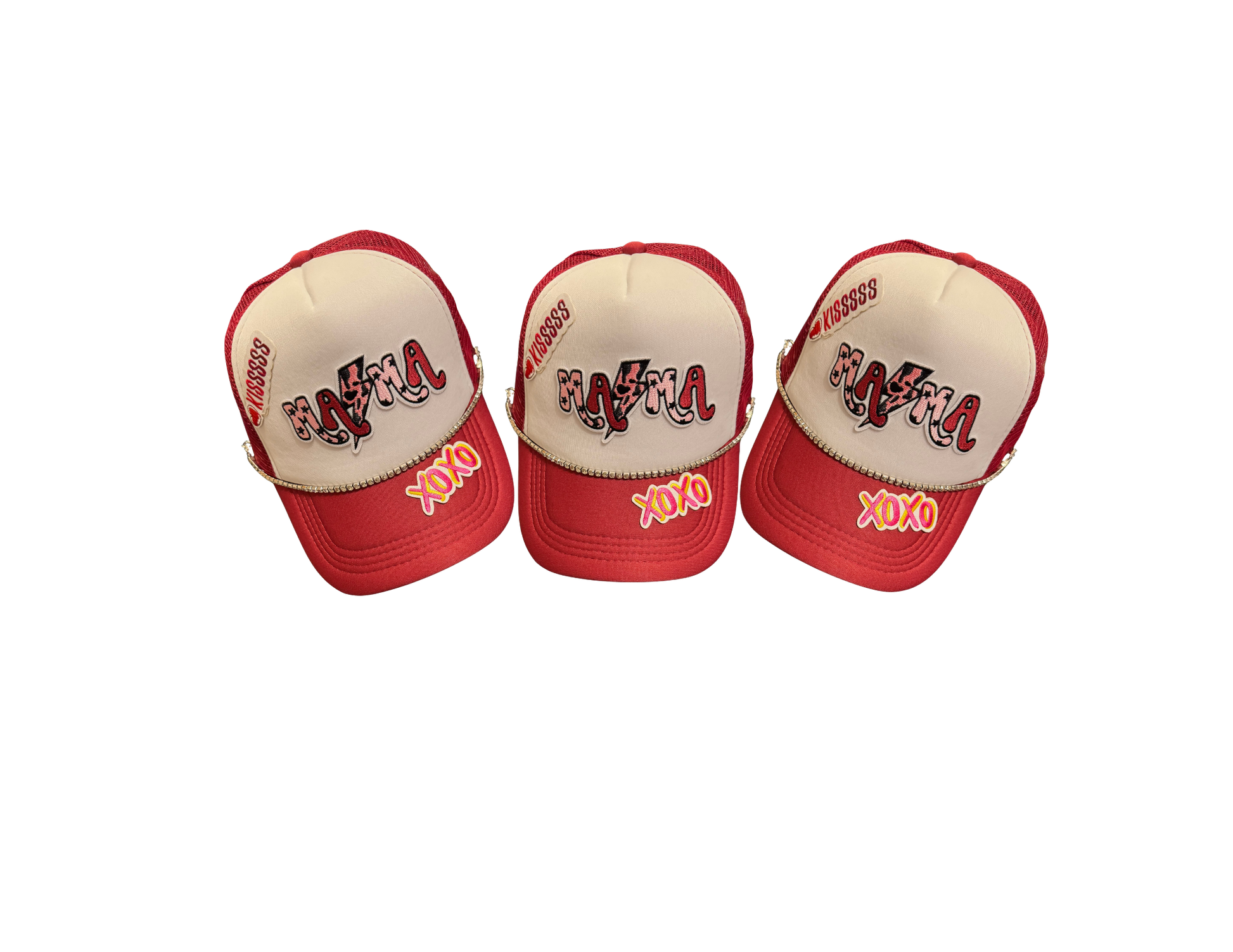 The red Mama XOXO trucker hat offers a comfortable one-size-fits-all design, making it a versatile accessory for any wardrobe. Its breathable mesh back ensures ventilation during wear, while the bold red color and distinctive "Mama XOXO" branding add a stylish touch. Perfect for casual outings or outdoor activities, this trucker hat combines practicality with a confident, expert look.